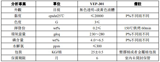 YEP-301系列系無(wu)溶劑、低粘(zhan)度、高磷含(hán)量含磷液(ye)態環氧樹(shù)脂,和(he)一般環氧(yǎng)樹脂類似(sì),適合(he)配合各種(zhǒng)各類的環(huán)氧樹脂固(gu)化劑、促進(jìn)劑、填料(不(bu)推薦碳酸(suan)鹽類)、輔料(liao)以及各種(zhǒng)溫度下的(de)固化反應(yīng),製造各種(zhǒng)各類的無(wu)鹵阻燃環(huan)氧樹脂產(chǎn)品。